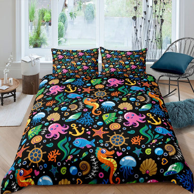 Kids Ocean Theme Bedding Set Kids Boys Octopus Seahorse Jellyfish Duvet Cover Cartoon Sea Animal Comforter Cover Colorful Sealife Bedspread Cover,Room Decor 2/3Pcs Bedding