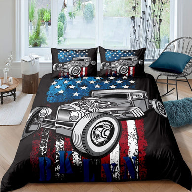 Vintage Car Duvet Cover Set Kids Boys Teens American Flag Print Bedding Set Watercolor Art Comforter Cover Luxury Microfiber Bedspread Cover,Room Decor 2/3Pcs Bedding