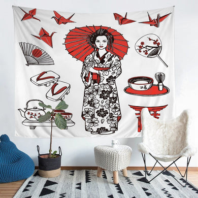 Japanese Women Tapestry for Girls Children Women Japanese-Style Wall Hanging Exotic Style Wall Blanket Room Decor Red Cherry Blossoms Wall Art Beach Throw Tapestry