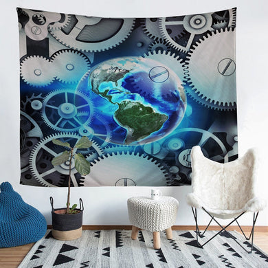 Blue Earth Wall Blanket Universe Planet Print Tapestry For Kids Women Men Adults Industrial Clock Theme Gears Wall Hanging Steampunk Style Gearwheel Decor Wall Art